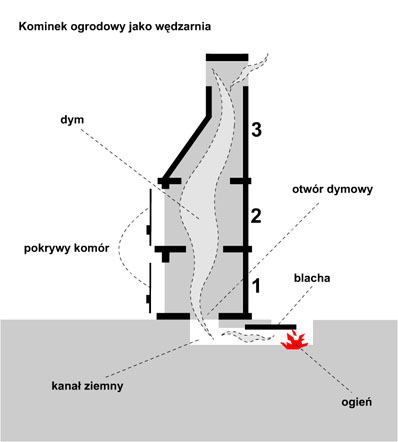 Wykorzystując kominek jako wędzarnię należy zakryć pokrywami komory 1 i 2, natomiast palenie rozpocząć z tyłu kominka w przygotowanym kanale ziemnym, biegnącym pod poziomem 1 do dolnego wlotu otworu dymowego (w odległości 100 cm od brzegu kominka). Przedmiot wędzenia należy umieścić w komorze nr 2 na wieszaku wędzarniczym lub ruszcie.